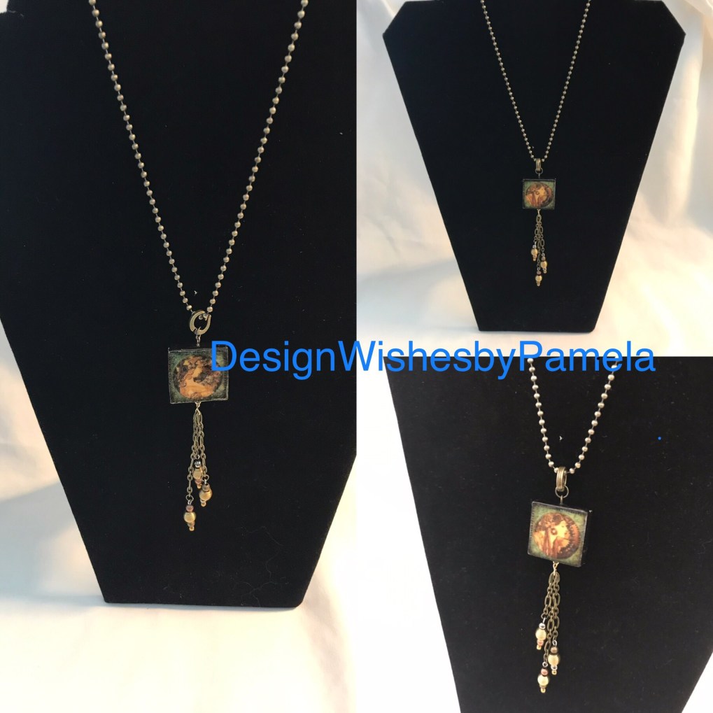 I designed this 1″ square pendant with my favorite motif from the collection. I used Glossy Accents to put an enamel look on the pendant and finished the pendant off with ball chain from Tim Holtz and hand beaded finishes I created.