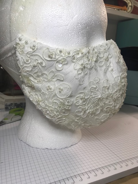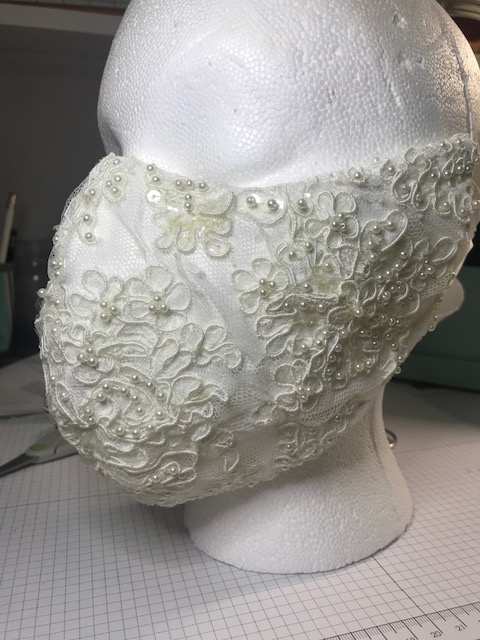 I was pleased with how the bridal mask turned out. I hand beaded the lace which was overlayed over a liner fabric for breathability.