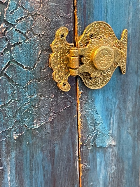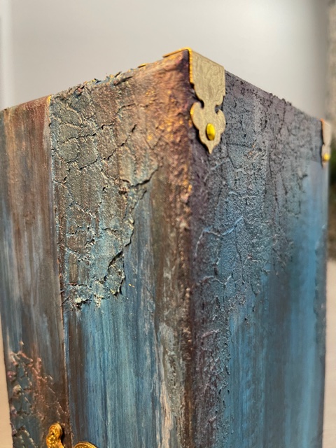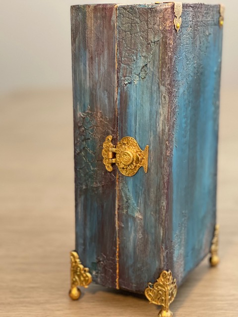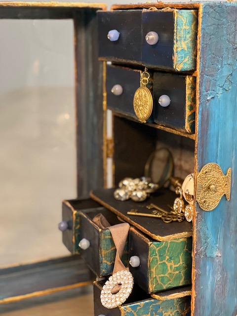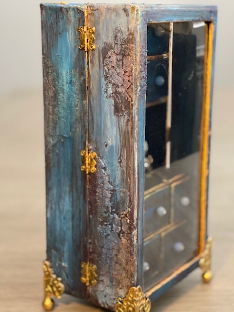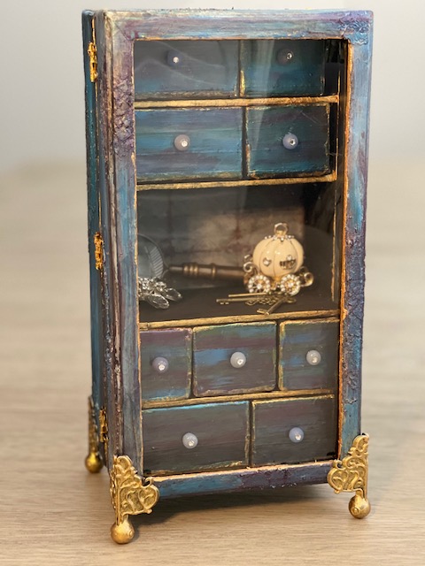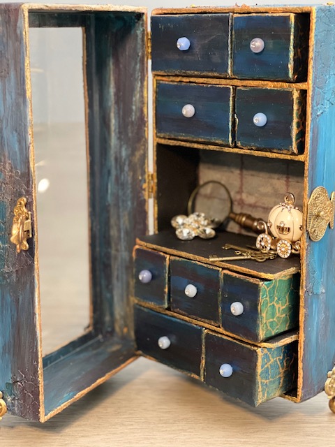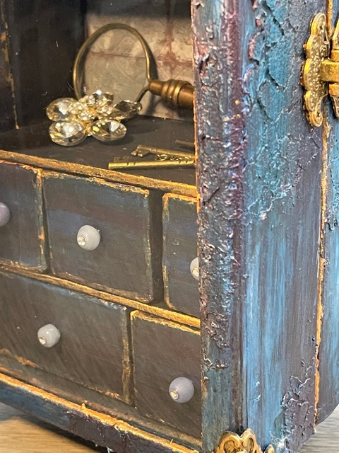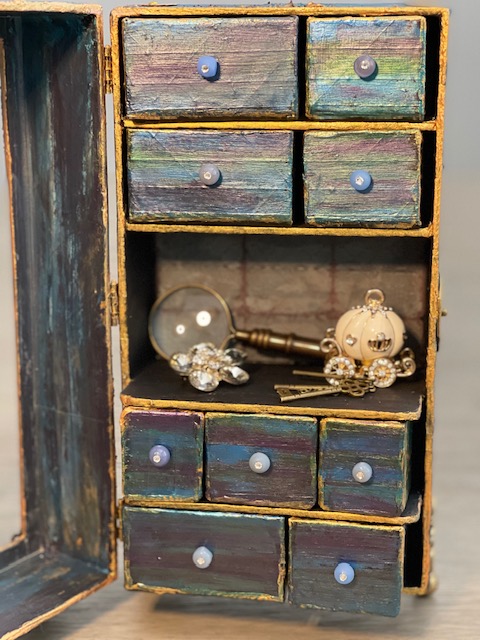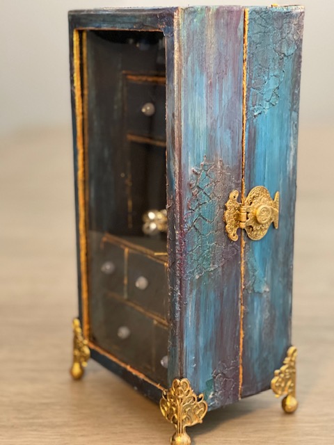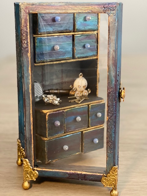 Once everything dry, I gave it 24 hours before I starting painting, I used a combination of Craftsmart Multi-Surface Premium Chalky Acrylic Paint in French Teal, Art-C Ultra Chalk Soft Matte Paint in Turquoise Blue and Art-C Metallic Paint in Eggplant, and Art Alchemy Metallique paint in Emerald Green and Deep Waters. I used Sparks paint for bits of highlighting over the entire box base. For the drawer fronts, I used a painting technique I learned many years ago. I floated three of the paint colors on my paint brush, then brushed over the drawer fronts giving them a blended paint look. The last step was spraying the entire project with Krylon Matte UV-Resistant Clear Acrylic Coating. I left the clear window that came with the Configurations box off to avoid getting overspray on it from the acrylic coating. I later attached the clear window using double-sided tape.