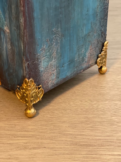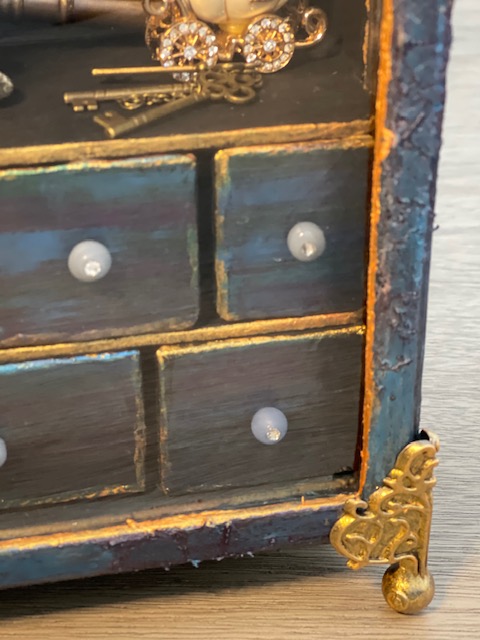 I used hardware pieces from my mixed media collection and Tim Holtz Idea-ology Foundations Box Feet. I painted all of the metal hardware in Prima Marketing / Finnabair Art Alchemy Sparks Paint in Ginger Magic. I also used the Sparks paint for detailing the edges of the drawers and box.