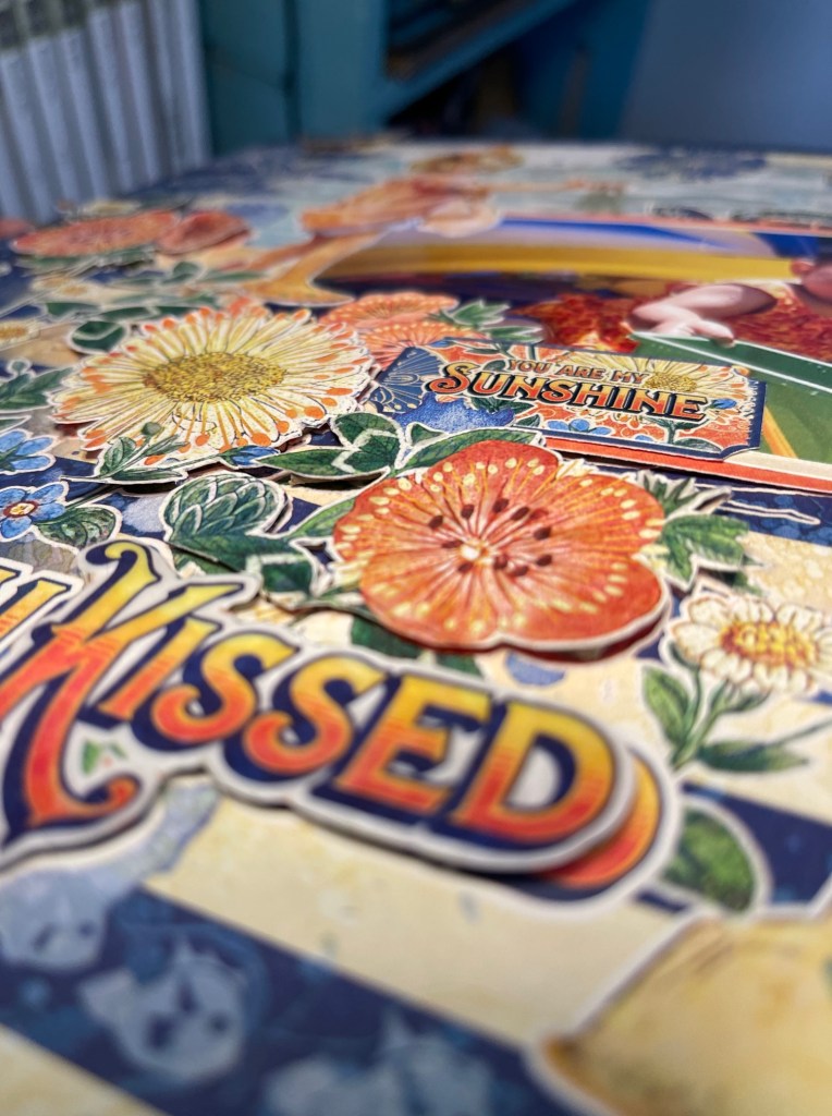 Lastly, I added some Iridescent Bright Gold Ink to the edges of a chipboard piece from the Floral Shoppe collection.