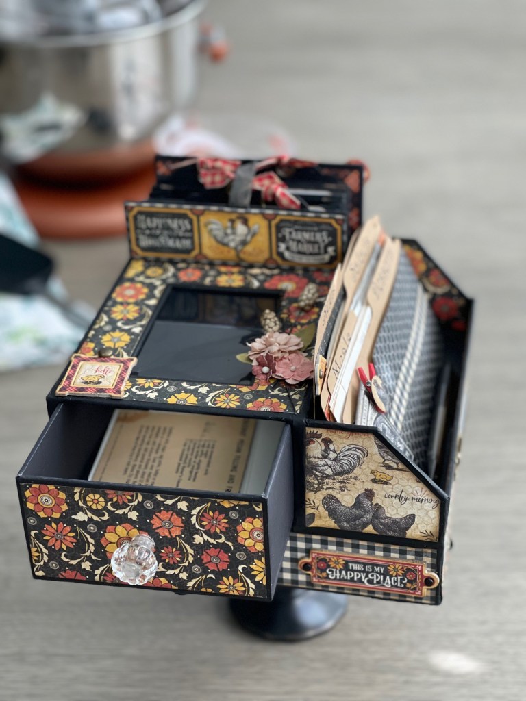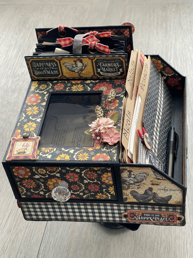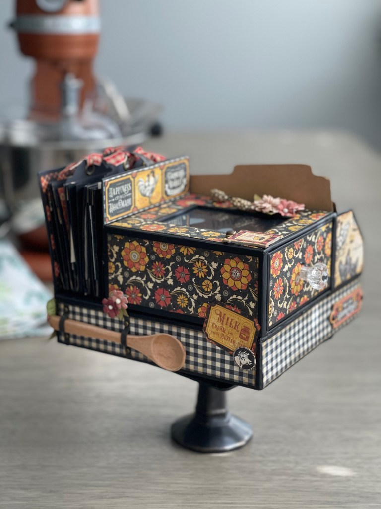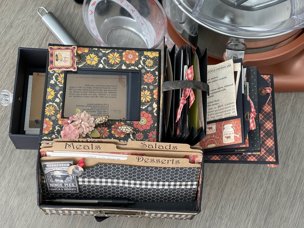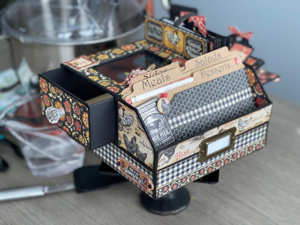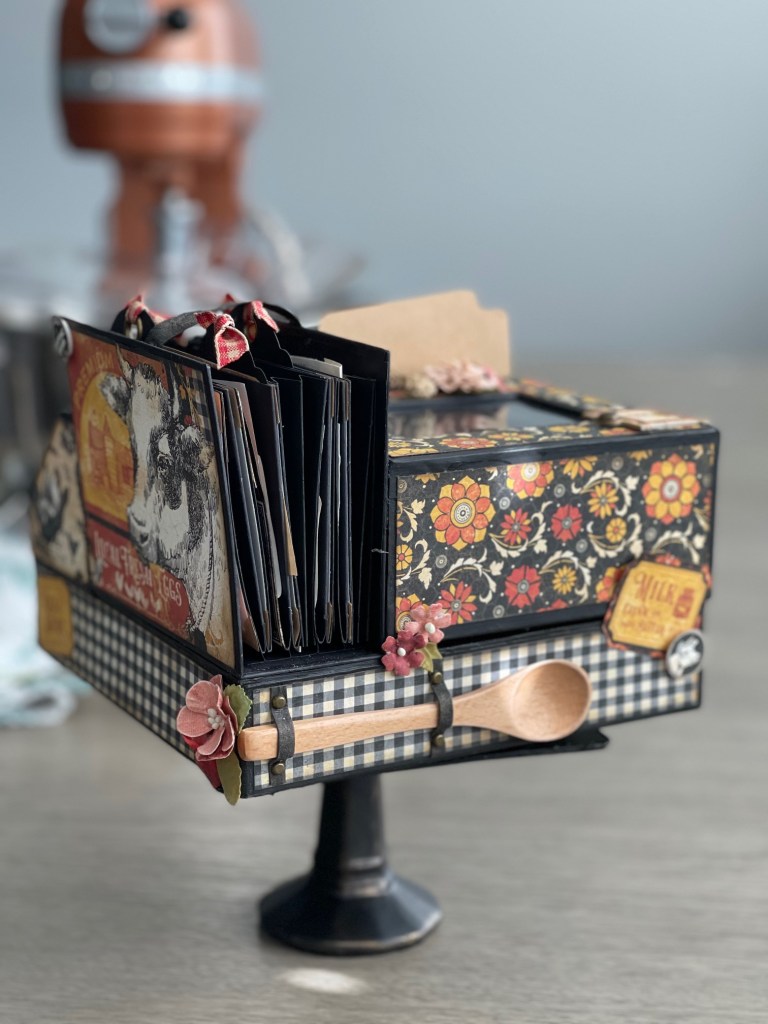 There are so many cute and whimsical elements incorporated in the design. A mini spoon and actual vintage recipes from my own recipe collection. I also used Graphic 45 ATC Tag & Pocket Album as well as the ATC Matchbook Box, both in black.