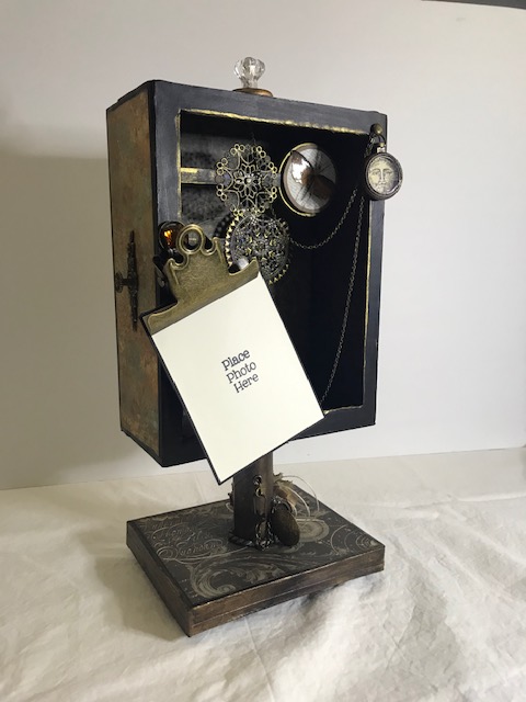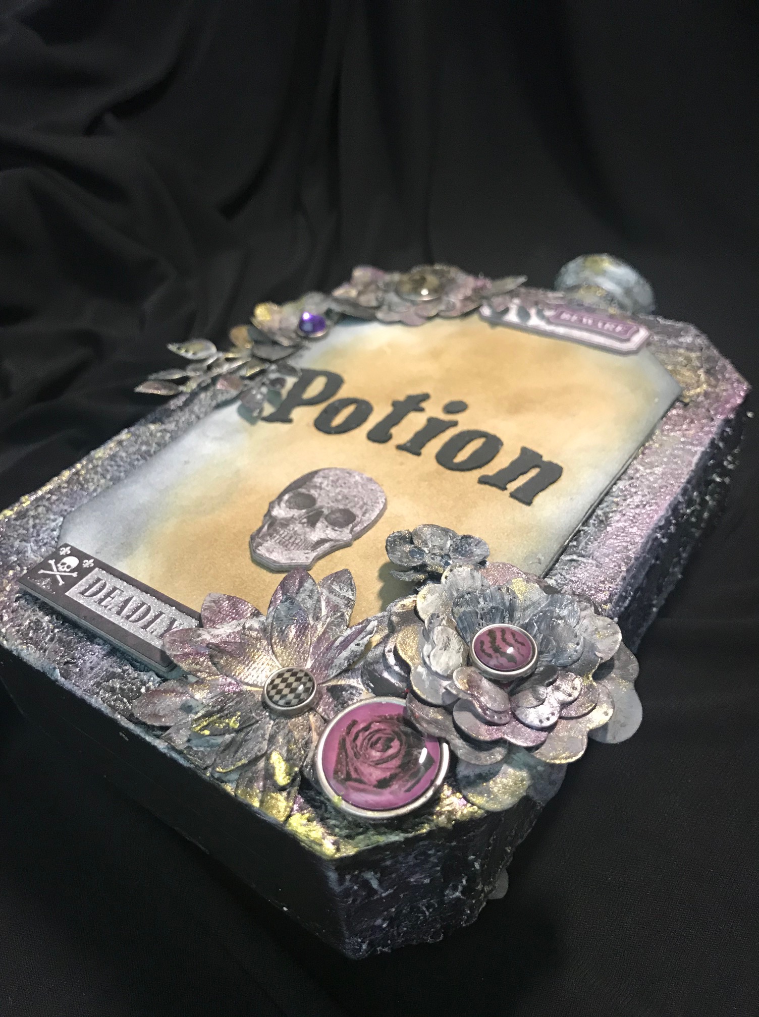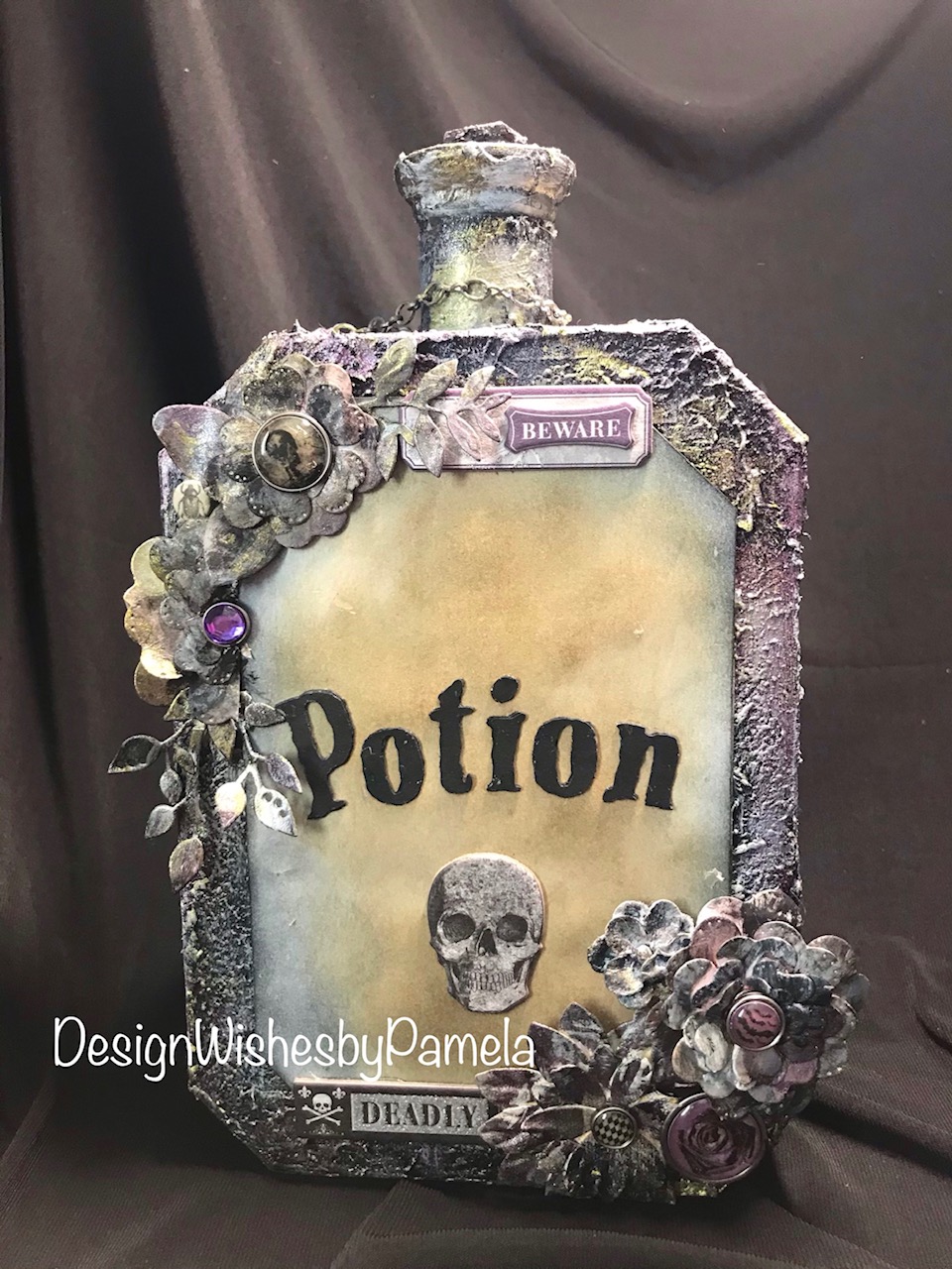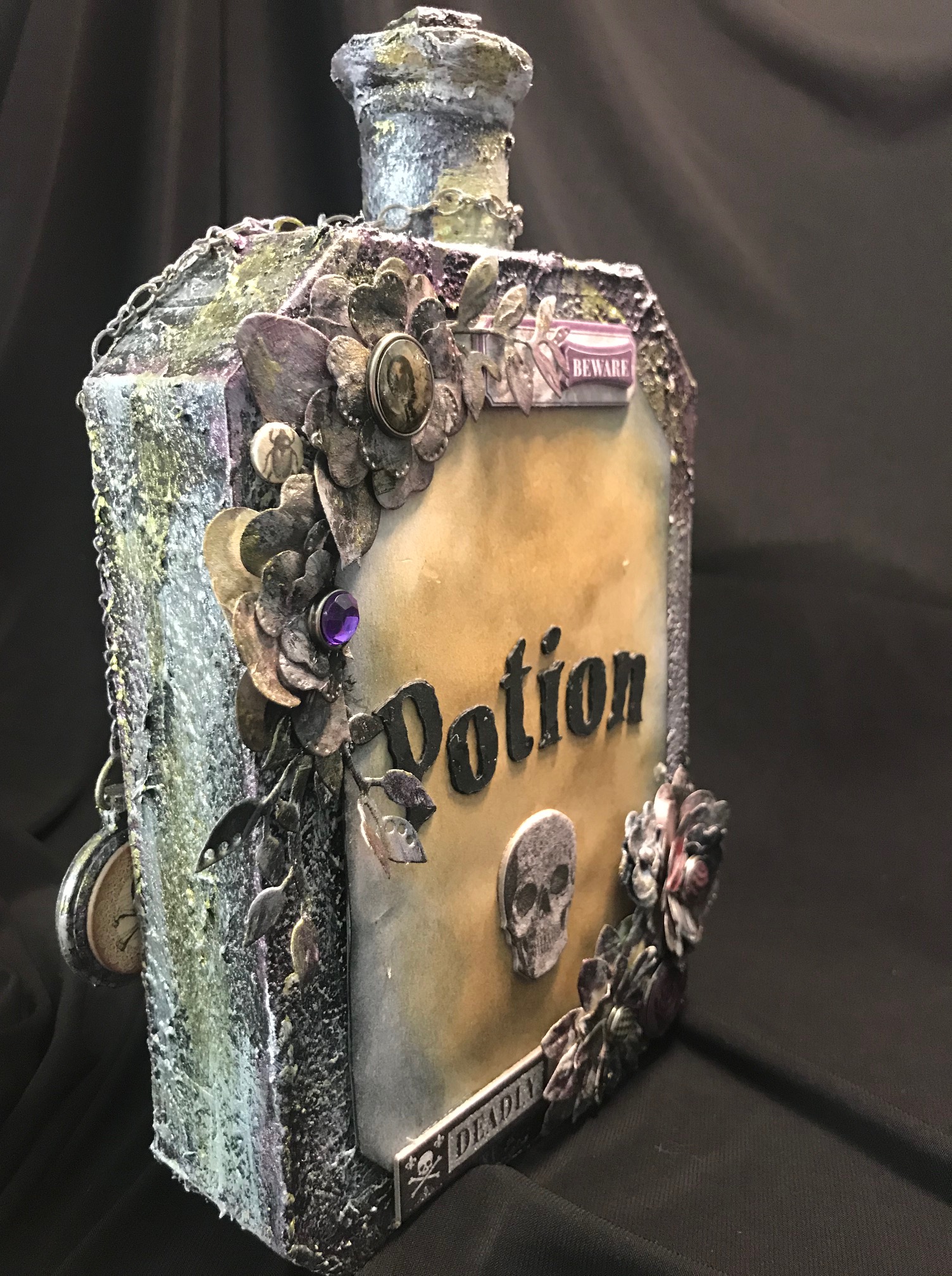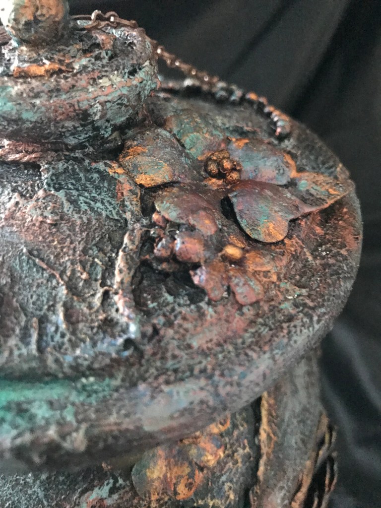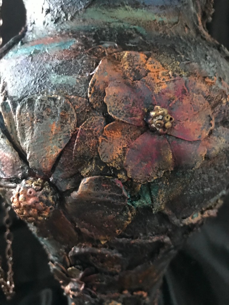 For this last project, I used chipboard to create the potion bottle. I also used a cardboard tube from a plastic bag roll, a wooden foot base from my mixed media supplies, and topped the bottle off with a stack of 1/2″ chipboard squares. The texture for the bottle was created using Liquitex Gesso and Blended Fibers Paste. The colors on the bottle was done with a layering of Liquitex Mars Black Acrylic Paint, Prima Marketing Inc/Finnabair/Art Alchemy Sparks Paint in Fairy Wings and Iris Potion along with Silver Spoon Metallique Acrylic Paint. I used a touch of White Satin Acrylic Paint from Craftsmart (purchased from Michael’s). The flowers were originally created by using the flower and leaves die from Graphic 45 Large Tag, ATC Tag & Flower Metal Dies set. I colored with a combination of Ranger Ink/Tim Holtz Distress Inks in Black Soot, Walnut Stain, Scattered Straw, and Vintage Photo. I also used Liquitex Gesso for base coating the flowers and the Mars Black Acrylic Paint. The chain was distressed with the same combination of paints and acrylics as mentioned before.