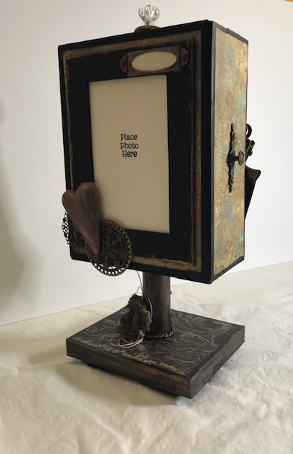 I use a variety of Finnabair/Prima Marketing Inc. Wax Cire Cera colors to create a “metal-like” effect. I also use Finnabair Art Basics Soft Gloss Gel and Heavy Gesso,and Art Ingredients Art Stones. In addition, I use Liquitex Gesso, Blended Fibers, and Light Modeling Paste to create texture and adhere the floral and cord details.