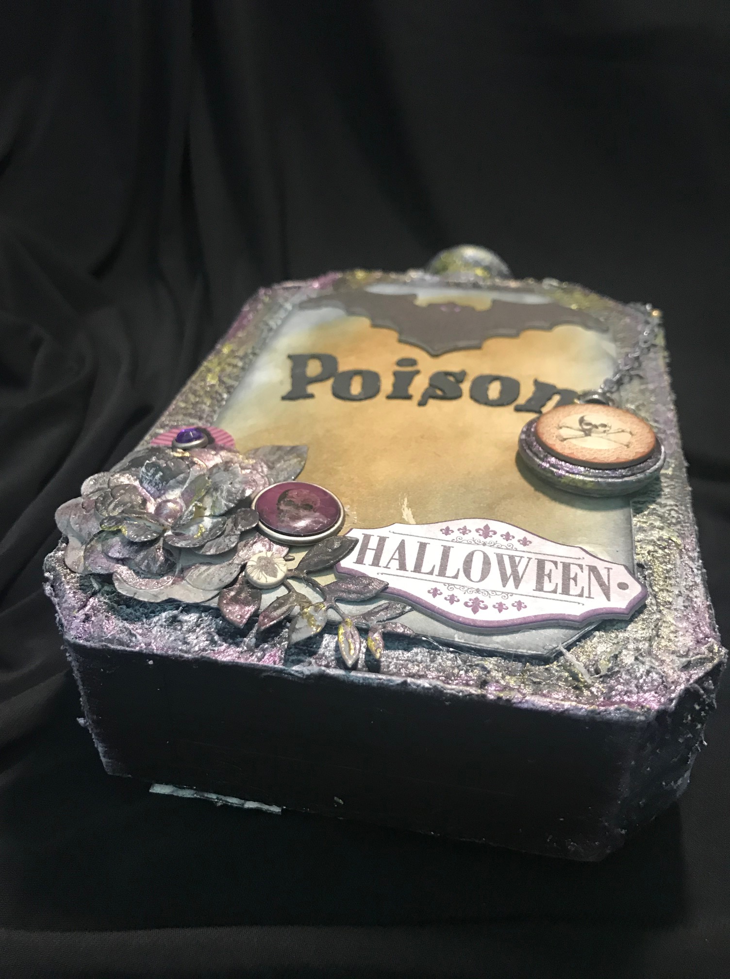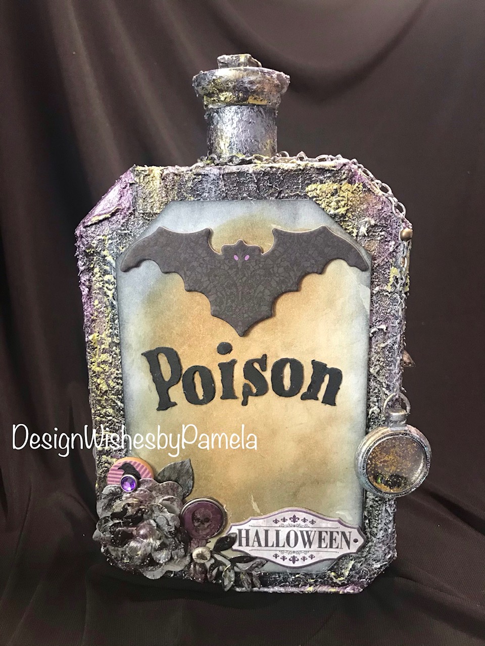 Additional accents for the bottle include chipboard and brad pieces from Recollections (Michael’s brand) and “Wicked Mechant Malvado” from My Mind’s Eye. I used a Mini Pocket Watch from Time Holtz Idea-olgy. For the Poison and Potion titles on the bottle, I used PN Goose Pimples font from Silhouette and cut the letters out on my Cameo 3 with Recollections black cardstock. I triple layered the letters to give a raised effect. I created the label bases by cutting cardstock in layering the cut pieces three times. I distressed the labels with Ranger Ink/Tim Holtz Distress Ink in Black Soot and Vintage Photo.